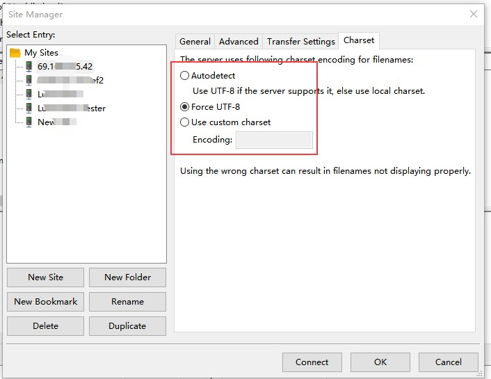 2. Select the FTP server for the desired change and click on the Charset tab , Changing the character set.